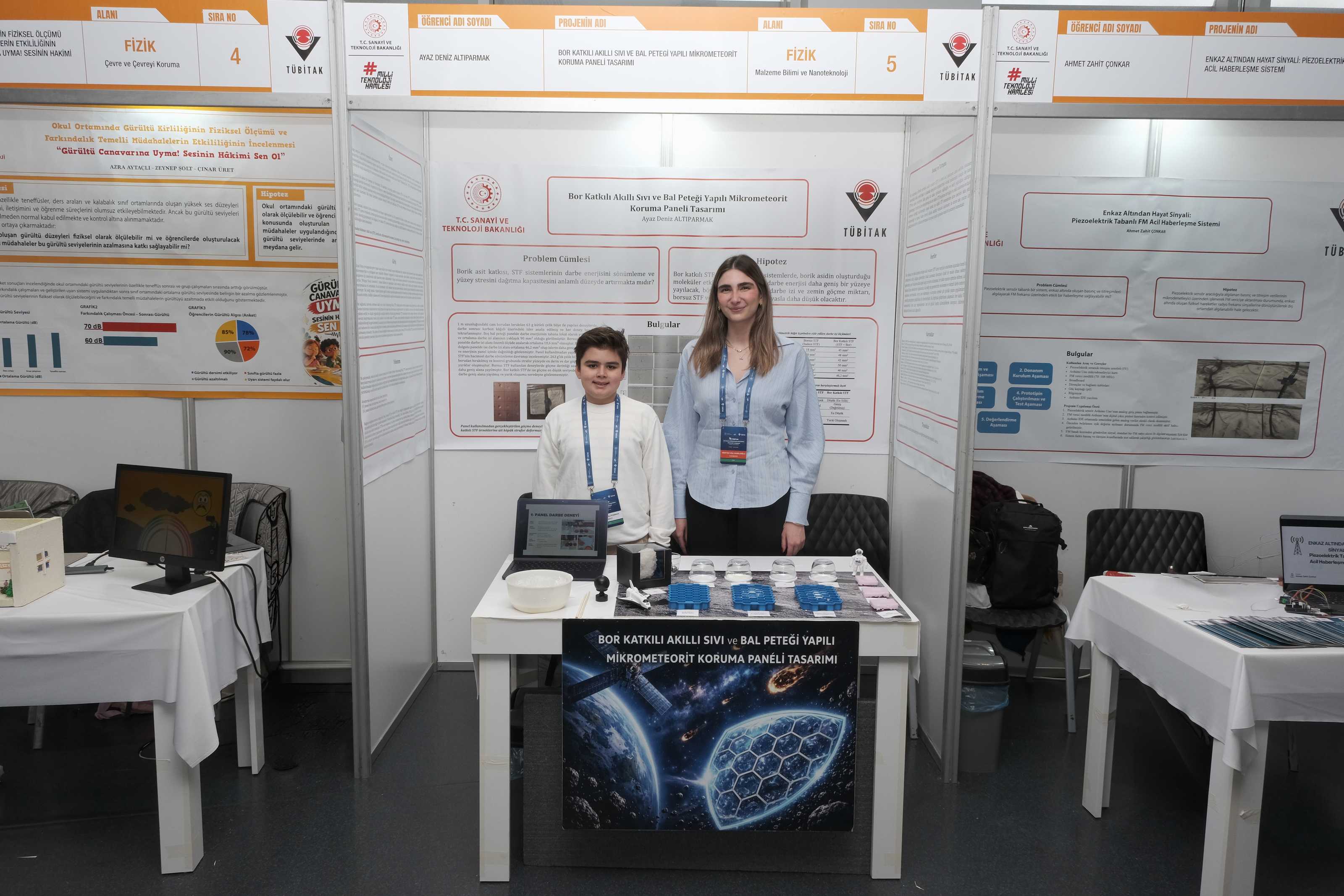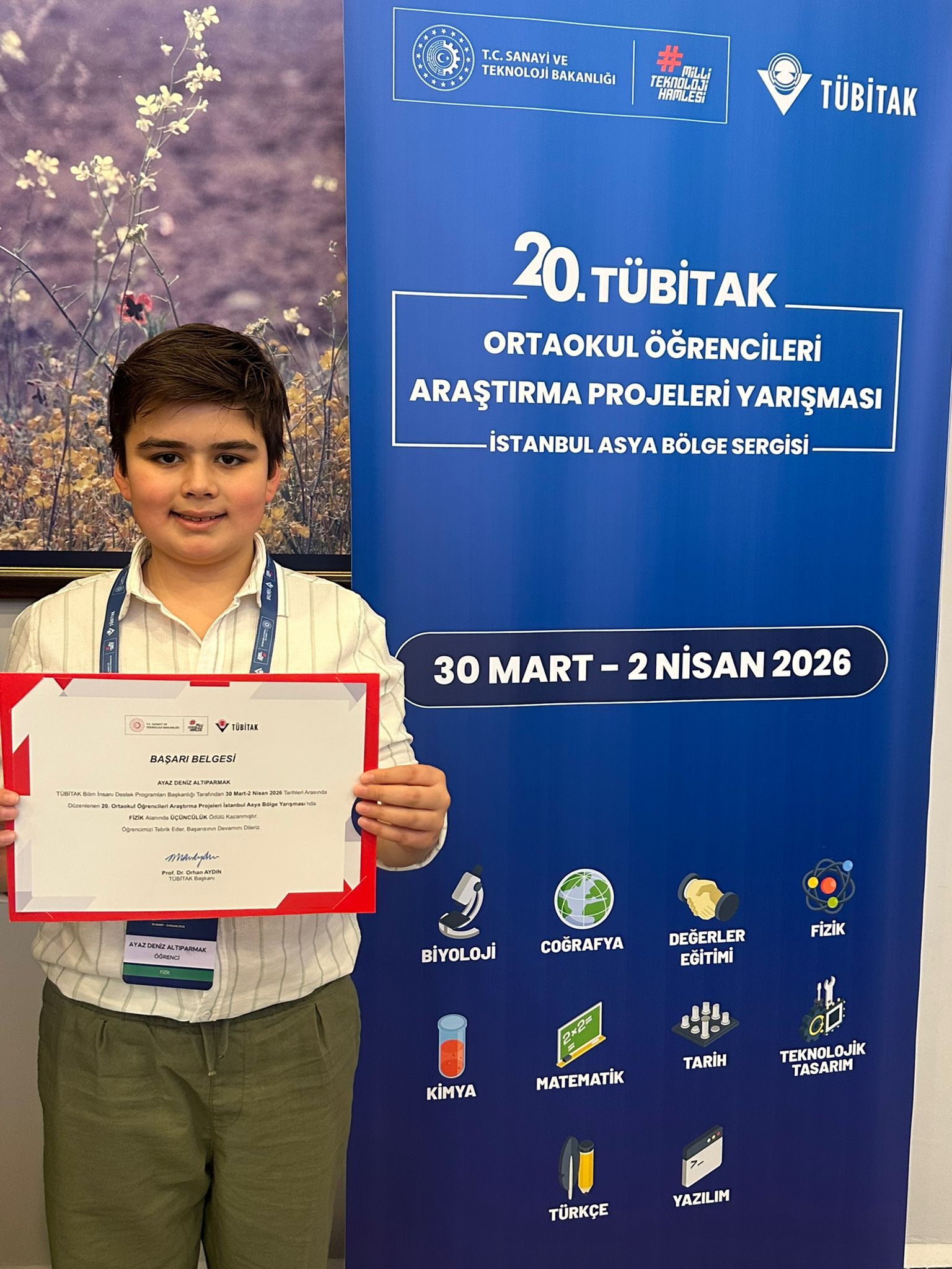 Beylerbeyi Ortaokulu öğrencimiz Ayaz Deniz Altıparmak, danışman öğretmeni M. Aslı Mısırlıoğlu rehberliğinde hazırladığı “Bor Katkılı Akıllı Sıvı ve Bal Peteği Yapılı Mikrometeorit Koruma Paneli Tasarımı” başlıklı projesiyle Fizik alanında Bölge Üçüncüsü oldu.